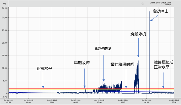 在大部分工厂,特别是离散制造业,都是生产是老大,设备只是保障部门,只要设备还能运转,就不会停产,这导致设备维护改善的时间和资金投入严重不足,设备部也陷入四处救火、穷于应付的被动恶性循环。究其原因,是因为企业没有从工厂端到端视角看设备停机的损失。在设备故障出现初期征兆的时候进行维护,远比造成停机后再维修造成的损失和投入成本要小得多。如下图所示,某机床通过振动分析,可以看到10月18日振动加速度峰值触发早期预警阈值,但是由于生产计划问题,没有停机维护;10月22日机床主控系统触发故障,不得不停机过10个小时维修和更换轴承,维修后,振动恢复正常水平,但较大损失已经造成。